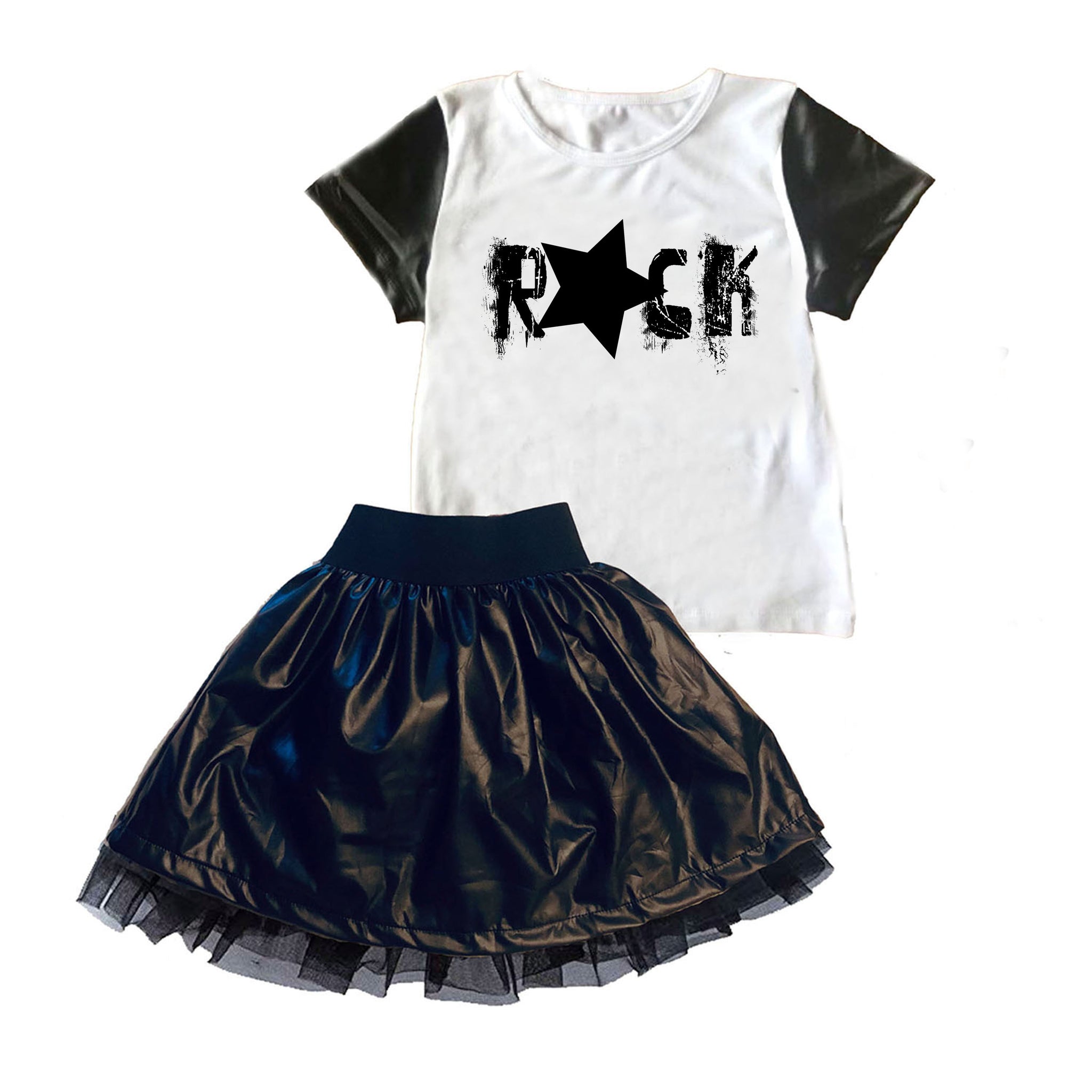 This graphic typography rock top with faux leather sleeves and faux leather skirt pair perfectly together creating a fun outfit for everday wear or special occasion. The skirt has a stretchable waistband for a comfortable fit. There is a fun detail and underlay of tulle to complete this fun look.